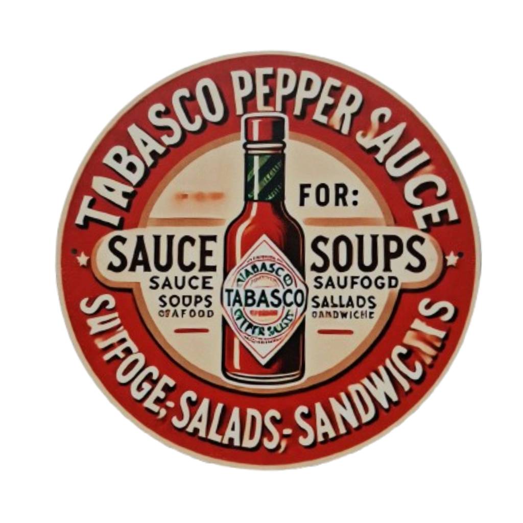 Μεταλλική στρογγυλή πινακίδα Tabasco σε διάμετρο 20cm, με αυθεντικό vintage design εμπνευσμένο από την εμβληματική αισθητική της διάσημης σάλτσας. Κατασκευασμένη από ανθεκτικό μέταλλο, ιδανική για διακόσμηση κουζίνας, bar, καφέ ή συλλεκτικό χώρο, προσθέτοντας ρετρό χαρακτήρα και spicy διάθεση στον χώρο.