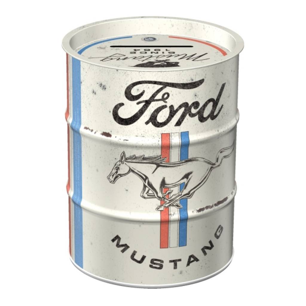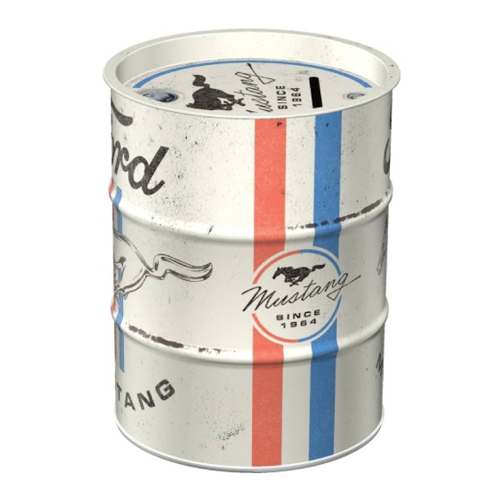 Μεταλλικός κουμπαράς σε σχήμα βαρελιού λαδιού με το εμβληματικό σχέδιο Horse & Stripes Logo της Ford Mustang. Ένα αυθεντικό συλλεκτικό κομμάτι για λάτρεις του αμερικανικού muscle car, που συνδυάζει retro design και